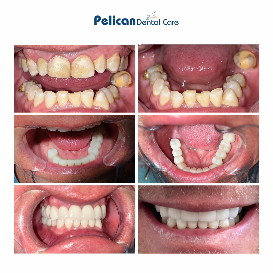 This full-arch transformation combined upper and lower crowns with strategically placed dental implants to restore balance, comfort, and a natural, confident smile. Each stage was planned with intention to support long-term stability and natural aesthetics.